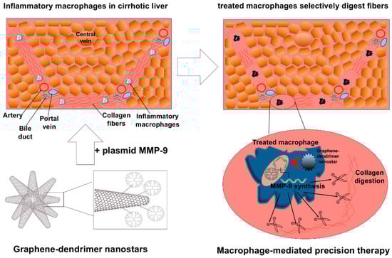 - Melgar-Lesmes, P.; Luquero, A.; Parra-Robert, M.; Mora, A.; Ribera, J.; Edelman, E.R.; Jiménez, W. Graphene-Dendrimer Nanostars for Targeted Macrophage Overexpression of Metalloproteinase 9 and Hepatic Fibrosis Precision Therapy. Nano Lett. 2018, 18, 5839–5845. [Google Scholar] [CrossRef] [PubMed]