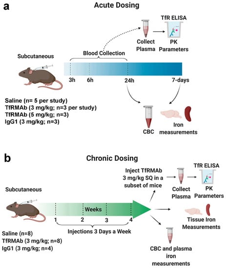 Schematic diagram summarizing the experimental study design for acute (a) and chronic (b) dosing. For acute dosing study, 22 mice were randomly assigned to receive 3 mg/kg (n = 3) or 5 mg/kg (n = 3) SQ dose of TfRMAb, 3 mg/kg SQ IgG1 control (n = 3), or saline (n = 5). Plasma was collected at 3-, 6-, and 24-h after injection to determine TfRMAb plasma concentrations in mice dosed with the 3 and 5 mg/kg TfRMAb. Terminal whole blood was collected for a complete blood count (CBC), and brains and spleens were excised. No CBC was performed on the 5 mg/kg dose. For the seven-day study, mice were treated with a single 3 mg/kg SQ TfRMAb dose (n = 3) or saline (n = 5) and observed for seven days after which whole blood was collected for a CBC, and brains were excised (a). For chronic dosing study, twenty mice were randomly assigned to receive saline (n = 8), 3 mg/kg TfRMAb (n = 8) or 3 mg/kg IgG1 (n = 4) SQ three days a week for four weeks. Blood was collected at the end of two weeks for a CBC and at the end of four weeks for iron parameters. A plasma PK study was performed one week after the end of chronic dosing and mice from all the experimental groups received a 3 mg/kg SQ dose of TfRMAb (b). The figure was created using Biorender.com.