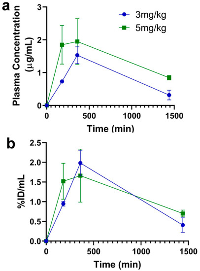 Plasma concentration-time profiles of the high-affinity bivalent TfRMAb following SQ injection. Mice were injected with TfRMAb (3 mg/kg or 5 mg/kg) via the SQ route and plasma samples were collected at 3 h (180 min), 6 h (360 min), and 24 h (1440 min) following injection. Plasma concentrations are shown as either µg/mL (a) or %ID/mL (b). Data are shown as the mean ± SEM of n = 3 per dose per time point.