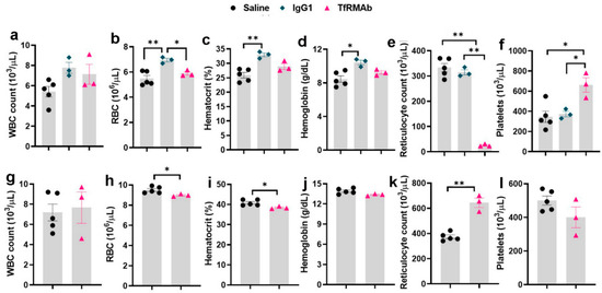 Complete blood count (CBC) data following acute dosing of the high-affinity bivalent TfRMAb in mice. Mice were treated with a 3 mg/kg SQ dose of TfRMAb, IgG1, or an equivalent volume of saline, and a CBC was performed either 24 h (a–f) or seven days (g–l) after the injection. No CBC data was collected for the mouse IgG1 treated mice at seven days. Data area shown as the mean ± SEM of n = 3–5 per group. * p < 0.05, ** p < 0.01.
