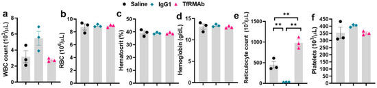 Complete blood count (CBC) data following chronic dosing of the high-affinity bivalent TfRMAb in mice. Mice were treated 3 days per week for four-weeks with a 3 mg/kg SQ dose of TfRMAb, IgG1, or an equivalent volume of saline, and a CBC (a–f) was performed at the end of two weeks. Data are shown as the mean ± SEM of n = 3 per group. ** p < 0.01.