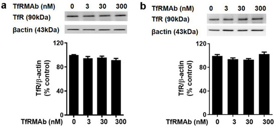 The effect of acute and chronic TfRMAb treatment on cultured mouse brain endothelial cells (bEND.3 cells) is shown in Figure 7. Treatment of bEND.3 cells with TfRMAb for up to 24 h (to mimic acute dosing) (Figure 7a) and 96 h (to mimic chronic dosing) (Figure 7b) did not alter TfR protein levels for TfRMAb concentrations ranging from 0 to 300 nM. No change in brain endothelial cell viability was observed when cells were treated with 0–200 nM TfRMAb for up to 24 h and 48 h (data not shown). There was a significant decrease in brain endothelial cell viability at high concentrations (2000 nM) of the TfRMAb (data not shown).