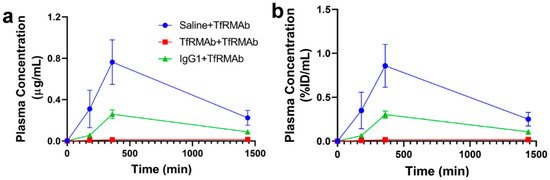 Plasma concentrations of TfRMAb in mice treated with a single 3 mg/kg TfRMAb SQ injection after chronic four-week treatment with saline, TfRMAb, or IgG1 are shown in Figure 8 and are represented in µg/mL (a) and % ID/mL (b). The Cmax of TfRMAb was 0.76 ± 0.2 µg/mL (0.86 ± 0.24% ID/mL), 0.016 ± 0.007 µg/mL (0.019 ± 0.008% ID/mL) and 0.26 ± 0.04 µg/mL (0.3 ± 0.04% ID/mL) in the saline-treated, TfRMAb-treated and IgG1-treated mice, respectively. In the mice that were chronically dosed with TfRMAb and IgG1, the AUC (0–24) of TfRMAb was 97% lower (p < 0.01) and 66% lower (p < 0.01), respectively, than that in the mice chronically dosed with saline (Table 2). The apparent clearance of TfRMAb in mice chronically dosed with IgG1 or TfRMAb was 130% (p < 0.05) and 5300% (p = 0.09) higher, respectively, than the clearance of TfRMAb in mice chronically treated with saline (Table 2).