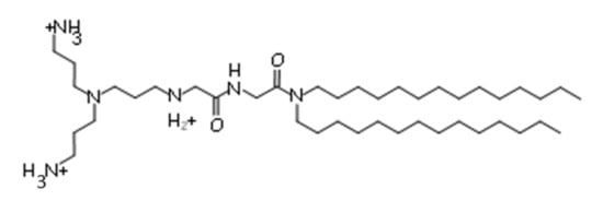 Chemical structure of 2-(3-[bis(3-aminopropyl)amino]propylamino)-N-ditetradecyl-carbamoylmethylacetamide (DMAPAP).