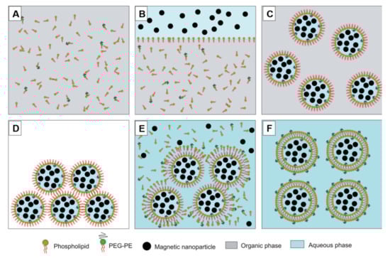Diagram of ultra-magnetic liposomes (UMLs) or MCLs preparation by reverse phase evaporation method. Phospholipids were dissolved in organic phase (CHCl3 + diethyl ether) (A); then, an aqueous phase containing MNPs was added (B); After 20 minutes of sonication, a water-in-oil emulsion was formed (C); Then, the organic solvent was evaporated, leading to the formation of a gel form (D); At the critical point, some vesicles were broken, and the excess phospholipid in the environment interacted with the residual micelles to complete the lipid bilayer, (E) leading to the formation of liposomes (F).