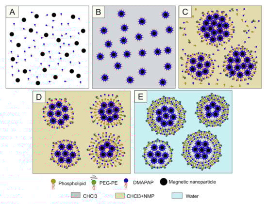 Diagram of MCLs preparation by cosolvent sonication method. Cit-MNPs and DMAPAP were mixed at an equal molar ratio in H2O (A); The aggregates (FF-DMAPAP) were collected and washed with ethanol before dispersion in CHCl3 (B); Next, FF-DMAPAP were mixed with other lipids in CHCl3. Then, a second solvent, N-methyl pyrolidone (NMP), was added (C); Due to a long period of sonication, a clear suspension was obtained (D); After the evaporation of CHCl3, addition of H2O, and dialysis, the cationic magnetic liposomes were formed (E).