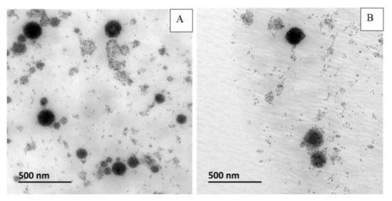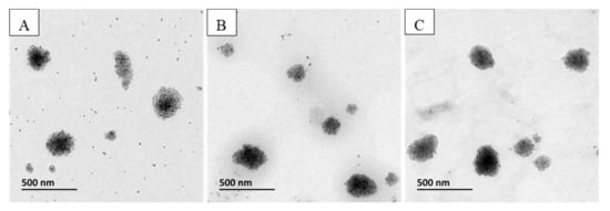 As we can see in Table 4, the presence of PEG-PE on the MCLs surface influences the liposome size as the MCL hydrodynamic size increased when the PEG length increased. However, the size of MCLs observed by TEM was independent on the length of PEG (Figure 9). This discrepancy might be explained by the fact that the hydrodynamic size of liposomes is measured by DLS, while non-hydrated liposomes are observed by TEM. The hydration layer around the liposomes is strongly influenced by the insertion of PEG chains, which interact strongly with the water molecules in the medium.