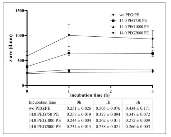 Dynamic size and PDI of cosol_MCLs in cell culture medium after incubation at 37 °C. Cosol_MCLs with various PEG-PE (14:0 PEG750-PE, 14:0 PEG1000-PE, 14:0 PEG2000-PE) or without PEG-PE (wo PEG-PE) were diluted 5 times in complete Dulbecco’s modified Eagle’s medium (DMEM) containing 10% fetal bovine serum (FBS), penicillin (50 U/mL), and streptomycin (50 U/mL), and incubated at 37 °C. Hydrodynamic size was measured by dynamic light scattering after 0 h, 1 h or 3 h incubation. The inserted table presents PDI value of the samples. The data given are averages of 3 different experiments (n = 3); bars, SD.