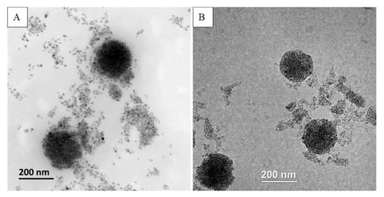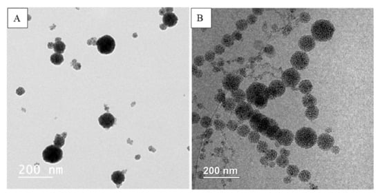 TEM image of MCLs prepared with: (A) 2.5 mM (REV_MCL_2.5) or (B) 10 mM (REV_MCL_10) of iron.