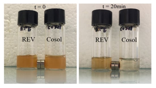 Attraction of MCL formulations when exposed to a magnet. REV_MCLs and cosol_MCLs were put in 2 vials at a concentration of 5 mM of Fe. Two small NdFeB magnets (0.34 T) were placed next to the vials for 20 min. REV:MCLs by reverse phase evaporation method; cosol: MCLs by the cosolvent sonication method.