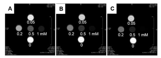T2 weighted MRI at 7 T of: (A) free MNPs; (B) REV_MCLs; and (C) cosol_MCLs at various iron concentrations in water.