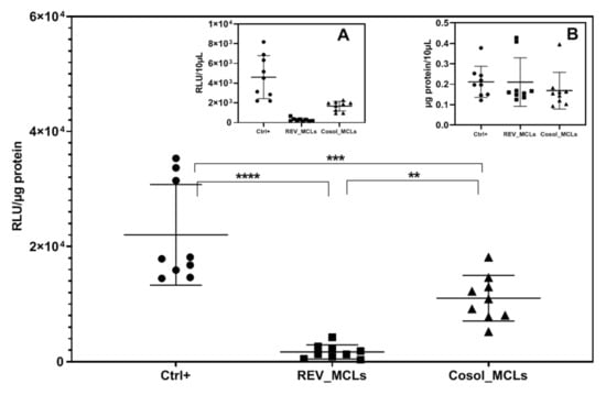 Transfection efficiency of lipoplexes at RC8 in a CT26 cell line. Cells were seeded at 104 cells/well in a 96-well plate. Luciferase and protein assay were carried out 24 h after the incubation of cells with 100 µL of lipoplexes containing 1 µg of pFAR4-luc in the absence of a magnetic field for 3 h. Transfection efficiency is calculated as RLU/µg protein. The data given are averages of 3 different experiments, each performed in triplicate (n = 9); bars, SD. One-way ANOVA was done with GraphPad Prism software, ** p ≤ 0.01, *** p ≤ 0.001, ****p ≤ 0.0001. Inserted figure: (A) RLU, (B) µg protein in 10 µL of cell lysis 24 h after incubation. RLU, relative light unit; RC = nmol DMAPAP/µg pFAR4-luc. Ctrl+ (dark circle): positive control (lipoplexes based on liposome DOPE/DMAPAP/C14PEG1000 49:50:1 mol/mol); REV_MCLs (dark square): lipoplexes based on REV_MCLs; cosol_MCLs (dark triangle): lipoplexes based on cosols MCLs.