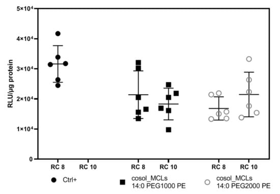 It was shown in other works that the charge ratio between cationic liposomes and plasmid DNA strongly affects the size, zeta potential, stability, toxicity, and therefore the transfection efficiency of the lipoplexes [35,36,37]. Figure 16 presents the transfection efficiency of cosol_MCLs–pFAR4-luc complexes with different PEG lengths at a charge ratio of 8 or 10. We can see that an increased ratio from 8 to 10 did not affect the level of protein nor the transfection level. The addition of PEG is known to result in a lower level of transfection, which is probably due to a lower internalization of the lipoplexes [38]. Nevertheless, the increase in PEG length from 1000 to 2000 did not alter the transfection efficiency of cosol_MCLs.