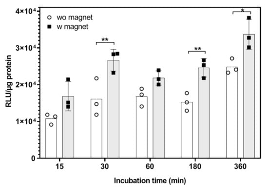 The transfection with cosol_MCLs at RC8 was highly efficient even after exposure to the lipoplexes for only 15 min, as indicated in Figure 17. When increasing the transfection time, the transfection efficiency increased. Moreover, in the presence of a magnetic field, the transfection was enhanced, even though not always significantly. The highest enhancement of magnetofection by 1.6 times was obtained with 30 min or 180 min of magnetic induction.