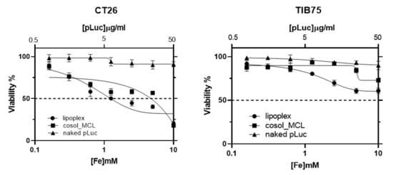Viability of CT26 (colon cancer) and TIB-75 (hepatocyte) cells after 24 h incubation with naked plasmid DNA (pFAR4-luc), cosol_MCLs, or lipoplexes (RC8). CT26 or TIB75 cells were seeded at 2 × 104 cells/well in a 96 well plate. Alamar blue test was carried out 24 h after incubation of cells with 100 µL of lipoplexes based on cosol_MCLs or cosol_MCLs or naked pFAR4-luc containing various concentration of pFAR4-luc and MNPs. The data given are the averages of 2 different experiments performed in triplicates (n = 6); bars, SD.