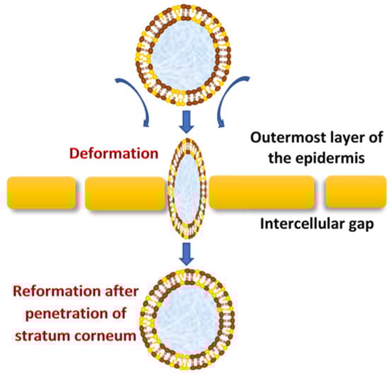 Vesicles are known as colloidal particles, which are an aqueous compartment enclosed by a concentric bilayer that are made-up of amphiphilic molecules. They are very useful as vesicular drug delivery systems, which transport hydrophilic drugs encapsulated in the inner aqueous compartment, whereas hydrophobic drugs are entrapped within the lipid bilayer []. With regard to transfersomes, they are highly deformable (ultra-flexible) and self-optimizing novel drug carrier vesicles, in which their passage across the skin is mainly associated with the transfersomes’ membrane flexibility, hydrophilicity and the ability to maintain the vesicle’s integrity (Figure 2) [,].