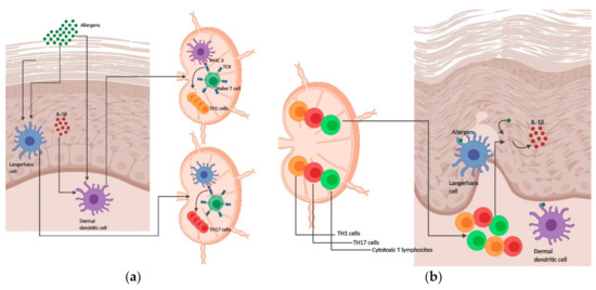 Allergic contact dermatitis (ACD) is one of the most common occupational diseases, affecting nearly 20% of the European population [1,2,3]. ACD is a type IV hypersensitivity response caused by repetitive exposure to a chemical sensitizer. These sensitizers are usually low-molecular-weight chemicals or metals (LMW), that are unable to elicit an immune response per se. Hence, LMW must covalently modify skin proteins or bind directly to major histocompatibility complex (MHC) molecules on the surface of antigen-presenting cells (APC) [4]. The pathophysiology of ACD is characterized by two distinct phases (Figure 1). First, the sensitization phase, when a susceptible individual is exposed to sensitizing chemicals, leading to the priming of the immune system. Second, the elicitation phase when re-exposure of sensitized individuals to the same chemical leads to ACD clinical manifestation within 24/72 h. These chemicals are highly electrophilic and can cross the stratum corneum, gaining access to viable epidermis [2,4], where they covalently bind to extracellular and cellular proteins—haptenization. These protein–hapten conjugates promote intracellular stress and xenoinflammation on epidermal cells, which is characterized by the release of damage-associated molecular patterns (DAMPs), such as reactive oxygen species (ROS), uric acid (UA), hyaluronic acid (HA) fragments and adenosine triphosphate (ATP) [5,6,7,8]. These DAMPs are then recognized by pattern recognition receptors (PRRs) such as Toll-like receptors (TLRs) and NOD-like receptors (NLRs) in innate immune cells, namely dendritic cells (DCs), leading to their maturation [9,10]. Upon capture and processing of the immunogenic hapten–protein complexes, dermal DCs undergo maturation and acquire the capacity to migrate toward local lymph nodes where they prime naive CD4+ and CD8+ lymphocytes. Naïve T cells become activated and differentiate into allergen-specific effector cytotoxic T lymphocytes (CTL) and effector T helper (TH) cells TH1 and TH17 (Figure 1a), which then disseminate systemically to peripheral tissues, including the skin (Figure 1b). At this point, immunological memory is mounted and the sensitization phase concluded [2,4].