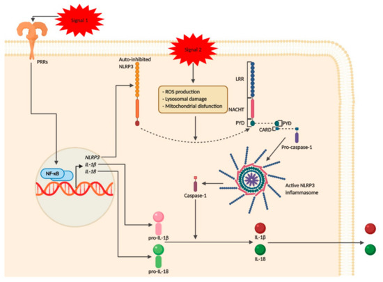 - Franchi, L.; Eigenbrod, T.; Muñoz-Planillo, R.; Nuñez, G. The inflammasome: A caspase-1-activation platform that regulates immune responses and disease pathogenesis. Nat. Immunol. 2009, 10, 241–247. [Google Scholar] [CrossRef]