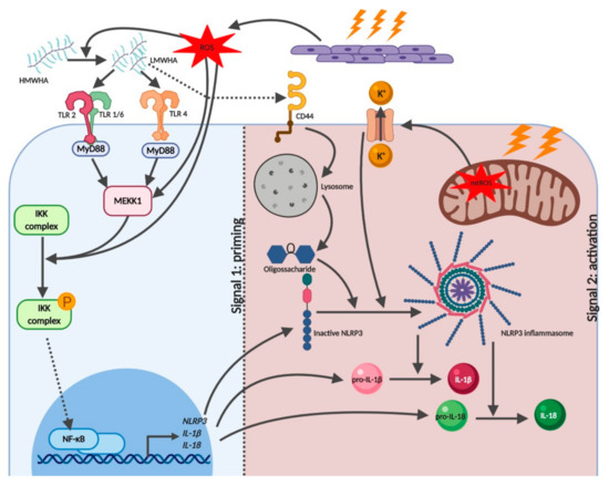 Given the role of LMWHA on the activation of crucial immunomodulatory pathways, expression of proinflammatory genes, as well as cytokines, it may be linked both to priming and assembly of the NLRP3 inflammasome.