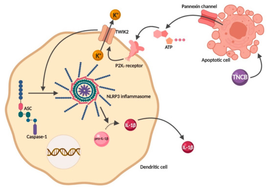 Apart from its commonly known role as the “molecular currency” for energy transfer within the cell, ATP also acts as a DAMP [61]. Upon allergen contact with the skin, keratinocytes and apoptotic cells release ATP into the extracellular milieu through pannexin channels, where it can bind to P2X7 receptors in DCs cell surface [62]. P2X7 is a ligand-gated ion channel that, upon activation, induces K+ efflux through the two-pore domain weak inwardly rectifying K+ channel 2 (TWIK2). Lower intracellular K+ leads to NLRP3 inflammasome activation and IL-1β secretion (Figure 4) [63,64].