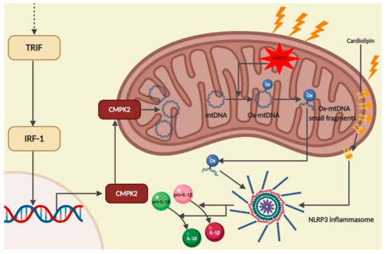Recently, Zhong and collaborators added a new piece of knowledge to this intricate network formed by TLR, ROS, mtDNA and inflammasomes. The authors showed that NLRP3 inflammasome priming and activation are linked through the induction of new mtDNA synthesis. Briefly, after TLR4 engagement, myeloid differentiation primary response 88—MyD88 (early time points) and TIR-domain-containing adapter—inducing interferon-β–TRIF (later stages) activate interferon regulatory factor 1 (IRF1)-dependent transcription of cytidine/uridine monophosphate kinase 2 (CMPK2), a rate-limiting enzyme that supplies deoxyribonucleotides for mtDNA synthesis [71].