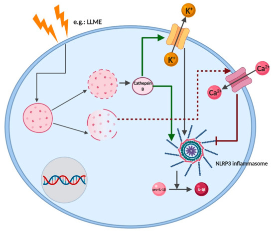 - Katsnelson, M.A.; Lozada-Soto, K.M.; Russo, H.M.; Miller, B.A.; Dubyak, G.R. NLRP3 inflammasome signaling is activated by low-level lysosome disruption but inhibited by extensive lysosome disruption: Roles for K+ efflux and Ca2+ influx. Am. J. Physiol. Physiol. 2016, 311, C83–C100. [Google Scholar] [CrossRef]