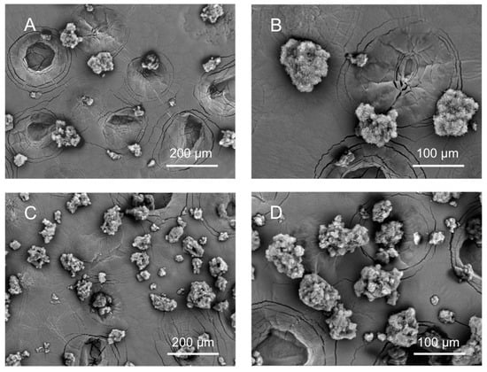 Scanning electron microscopy (SEM) images of (A,B) GMS-LID0 and (C,D) GMS-LID4 particles. The processing of GMS with LID did not influence the overall appearance and shape of the particles.