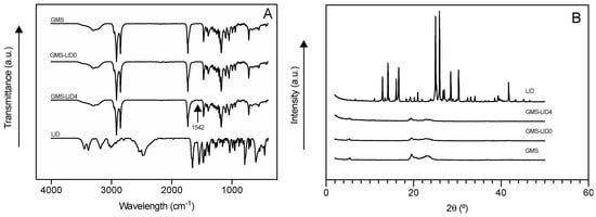 (A) Attenuated Total Reflectance/Fourier-Transform Infrared Spectroscopy (ATR/FT-IR) spectra and (B) X-ray diffraction (XRD) patterns of pure GMS, solid lipid microparticles (SLMPs) of GMS processed by the Particles from Gas-Saturated Solutions (PGSS) technique (GMS-LID0), SLMPs loaded with LID (GMS-LID4), and pure LID powder.
