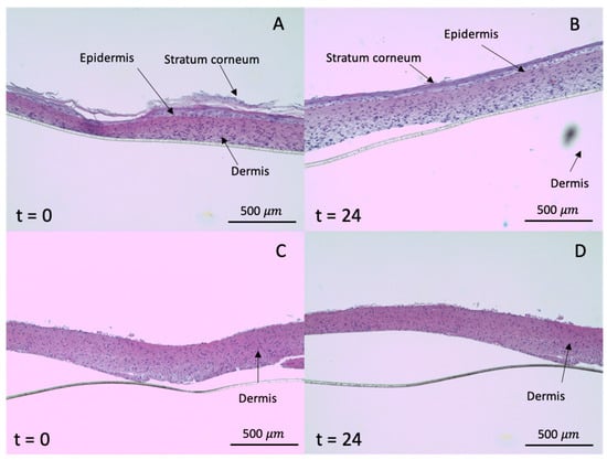 Histological analysis of fixed full thickness skin (containing epidermal and dermal layers, A and B) and skin equivalents with only dermis (C and D) before (t = 0 h) and after (t = 24 h) the LID permeation experiment from GMS-LID4 particles in the cellular inserts.