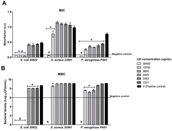Antimicrobial activity of LID obtained by determination evaluation of minimum inhibitory concentration (MIC) (A) and minimum bactericidal concentration (MBC) (B) for Escherichia coli 25922, Staphylococcus aureus 33591, and Pseudomonas aeruginosa PA01 strains. * Statistically different (p < 0.05) compared with bacterial growth without LID (positive control). # Absorbance of bacterial growth lower or equal to the control negative (absorbance of medium without bacteria). & statistically different (p < 0.05) compared with initial bacterial concentration (negative control MBC).