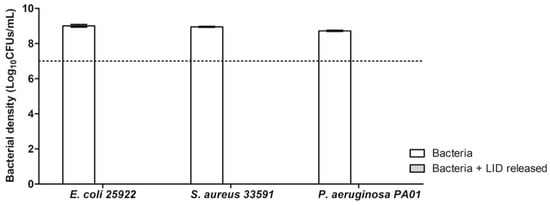 Bacteria were grown overnight in MHB at 37 °C and 150 rpm and a bacterial suspension of ca. 107 cells/mL. GMS-LID10 particles (40 mg) were dispersed in 5 mL of PBS pH 7.4. Then, 180 µL of PBS with LID released from GMS-LID10 particles and 20 µL of bacterial suspension were placed (five for each condition) in 96-well plates. After 24 h incubation at 37 °C and 150 rpm, the cultivable bacteria were quantified by the colony-forming units (CFUs) method. Bacterial density (in log10 CFUs/mL) was plotted according to each condition. Bacterial growth without LID was used as control. All experiments were performed in quintuplicate with two repeats.
