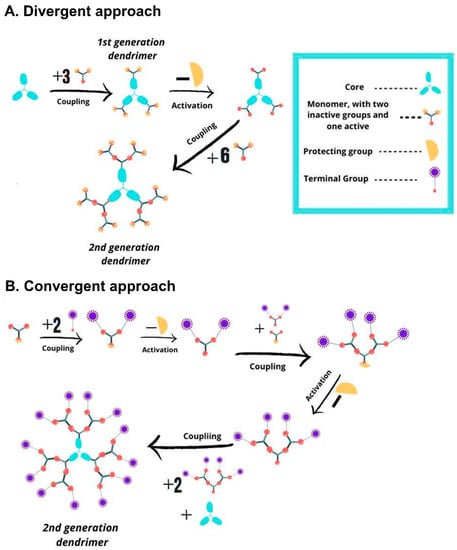 Dendrimers consists of three main domains: (1) The core, located in the center of the dendrimer, which can comprise one or multiple atoms; (2) the branching units, which are covalently linked to the core, whose repetition leads to a series of dialectically-concentric layers. The number of these layers is known as the dendritic “generation”; and (3) the terminal groups, mainly located on the surface of the dendritic scaffold, and highly responsible of the dendrimer properties [25]. Two “traditional” synthetic routes are prevalent (Figure 1): the divergent strategy and the convergent strategy [23]. In the divergent growth approach, first developed by Tomalia et al. [26], the dendrimer synthesis proceeds inside-out from the core. The core reacts with ABn monomeric units through the A functional group, while the B groups are dormant/protected and will react in a subsequent step after deprotection/activation. Iterative growth and activation steps lead to the desired generation, while the end-groups are available for further postfunctionalization. The divergent growth is the most viable approach, as it employs an excess of inexpensive reagents, but could lead to structural defects at high generations due to incomplete substitutions. The convergent growth approach was initially developed by Hawker and Fréchet, to improve the weaknesses of the divergent approach. This outside-in strategy relies on the coupling of monomers to generate monodisperse dendrons, which are finally attached to a multifunctional core through their focal points. While the risk of structural defects is minimized, the synthesis of higher generation dendrons and dendrimers are challenging due to steric hindrance, leading to low yields. Importantly, new strategies, namely “accelerated growth” approaches, are continuously evolving to simplify the synthetic routes while keeping their perfection. These include the orthogonal chemoselective strategy and the one-pot approaches, among others. The number of steps is thus reduced, as the chemoselective moieties avoid the need for protection/deprotection steps. The reader is referred to excellent reviews on this topic [23,27].