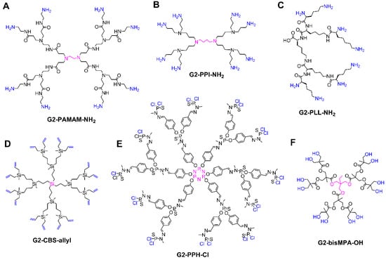 Overview of the most common dendritic families for biomedical applications, depicting the structure of second generation dendrimers. (A) Poly(amino amide) (PAMAM). (B) Poly(propylene imine) (PPI). (C) Poly(L-lysine) (PLL). (D) Carbosilane (CBS). (E) Poly(phosphorhydrazone) (PPH). (F) Bis-MPA polyester. The core is highlighted in pink, the terminal groups in blue.