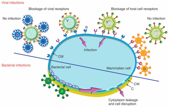Proposed mechanism for the antiviral effect (top, through blockage of viral or host cell receptors) and antibacterial activity (bottom, through electrostatic interaction and subsequent disruption of bacteria membrane) of dendrimers. Reprinted with permission from Ref. [57], copyright © 2012 Wiley Periodicals, Inc.