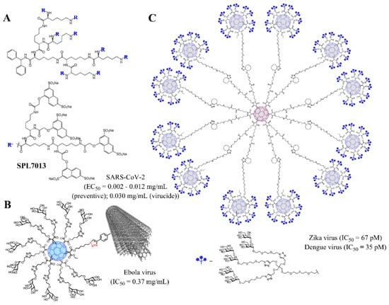 Dendrimers and dendronized materials, such as fullerenes and carbon nanotubes, have also promising activity against other viruses like SARS-CoV-2 [78], Figure 5A; Ebola virus [88], Figure 5B; Zika and Dengue viruses [89], Figure 5C; HSV [90]; cytomegalovirus [91]; some flavivirus, such as the responsible of the Japanese encephalitis [92]; and different human or aviary flu viruses [93].