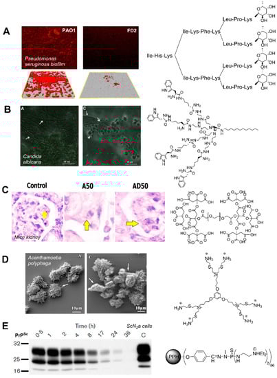 Examples of the antimicrobial activity of different dendritic molecules. (A) Inhibition of Pseudomonas aeruginosa biofilms by glycopeptide dendrimer FD2. Figure reprinted from ref. [100], Copyright 2008, with permission from Elsevier. (B) Effect on Candida albicans biofilm after treatment with a peptide dendrimer (16 µg/mL). Figure reprinted from Ref. [102], Copyright 2015, with permission from Elsevier. (C) Decrease in the number of Leishmania Major parasites in mice kidney after treatment with a dendritic polyester (A50) and amphotericin B loaded dendrimer (AD50). Figure reprinted by permission from ref. [103], Springer Nature, Copyright 2018. (D) Alterations of Acanthamoeba polyphaga trophozoites after treatment with a carbosilane dendrimer (2 mg/L). Figure reprinted from ref. [104]. (E) Evolution of PrPSc levels in ScN2a cells after treatment with a G4 PPH dendrimer (10 µg/mL). Reprinted with permission from Ref. [105], SGM, Copyright 2004.