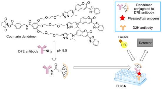 An important epidemiological study of the prevalence of malaria in Salomon Islands revealed the high rate of asymptomatic patients, highlighting the need for a diagnostic tool with high sensibility and specificity to detect Plasmodium [144]. This study relied on PCR and Rapid Diagnostic Tests (RDT), which are more sensible than a simple inspection with a microscope, but also far more expensive. In order to find a sensible detection method with a lower cost, a dendrimer-based assay was approved in South Korea [145]. The coumarin-derived dendrimer-based fluorescence-linked immunosorbent assay (FLISA) could detect two specific antigens of malaria: Histidine-rich protein II (HRP2) and lactate dehydrogenase (LDH). FLISA has good spectroscopic properties, such as photostability [146], and a better performance than traditional ELISA, enabling the quantification of the number of parasites in a sample even if they are present in low concentrations. Accordingly, FLISA method could be useful to detect asymptomatic cases at a modest price and with a high capacity. The process is depicted schematically in Figure 7.