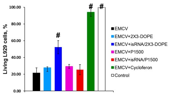 The possibility of protection against EMCV as a result of stimulation of INF synthesis was evaluated in vitro after treatment of lung fibroblasts of mice with isRNA complexed with 2X3-DOPE or P1500 liposomes. The protective effect against EMCV was more pronounced when isRNA/2X3-DOPE liposomes were used, while cell treatment with the isRNA/P1500 formulation did not protect them from EMCV infection. We suggest that the low protective activity of isRNAs/P1500 formulation compared to the isRNA/2X3-DOPE is associated with inefficient delivery of isRNAs to the cells, similar to the low efficiency of delivery observed for this formulation for plasmid DNA and siRNAs in cell culture [