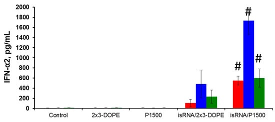 Figure 2). Comparison of the interferon-inducing activity of isRNA in BALB/c, CBA and C57Bl/6 mice showed that PEGylated liposomes significantly enhance the interferon-inducing activity of isRNA in vivo. The most significant increase in the serum IFN-α2 level after isRNA/2X3-DOPE administration was detected in CBA mice (up to 500 pg/mL), whereas the level of IFN-α2 in C57Bl/6 mice was about 50% lower (up to 230 ng/mL). The IFN-α2 level in BALB/c mice was much lower and did not exceed 105 pg/mL. Injection of isRNA/P1500 caused a more significant induction of IFN-α2 synthesis: its serum levels were 550, 1733 and 600 pg/mL for BALB/c, CBA and C57Bl/6 mice, respectively (