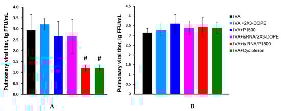 Analysis of the antiviral effect of isRNA/P1500 in the influenza model on C57Bl/6 mice showed that the titer of the virus was remarkably reduced in the lungs of mice receiving isRNA/P1500 only 24 h after the challenge (