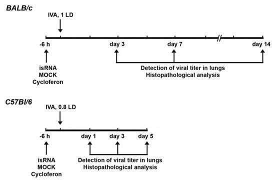 We compared the course of influenza infection in BALB/c and C57Bl/6 mice to determine the efficacy and mechanism of the antiviral action of isRNA. Mice were intranasally infected with IVA (0.8 LD