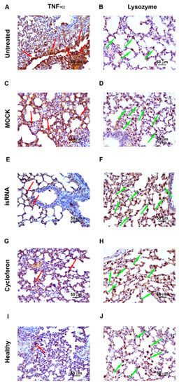 In healthy mice, the volume density of the TNF-α-positive cells was 14% ± 2.6% and the numerical density of the lysozyme-positive cells was 26.3 ± 1. After IVA infection, the volume density of TNFα-positive cells increased 2.3-fold compared to the healthy control and constituted 32.2% ± 4.7%, and the numerical density of lysozyme-positive cells decreased 2.3-fold and constituted 11.1 ± 0.6. After administration of isRNA/P1500 complexes, the volume density of TNFα-positive cells decreased 1.9-fold, and the numerical density of lysozyme-positive cells increased 2.2-fold compared to the untreated control and constituted 16.6% ± 3.2% and 24.7 ± 1.1, respectively, which is not statistically different from the level of healthy animals. The volume density of TNF-α-positive cells and the numerical density of lysozyme-positive cells in MOCK-treated mice also did not differ significantly from the untreated control and constituted 34.2% ± 4.3% and 13.4 ± 0.8, respectively.