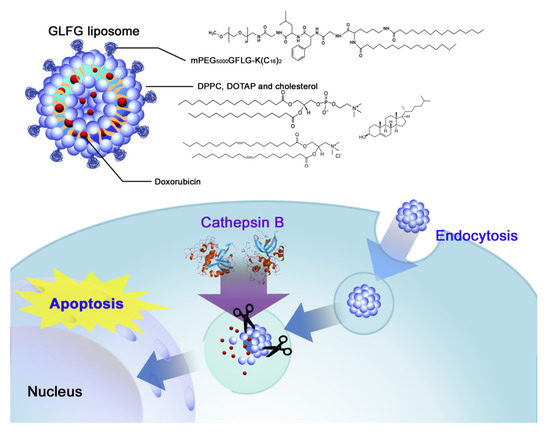 In this study, we designed a cathepsin B-responsive liposome using the ‘GLFG’ oligopeptide for the delivery of the anticancer drug, doxorubicin (Dox). A cathepsin B-cleavable peptide linker was introduced into the PEG lipid for the site-specific release of encapsulated drugs. The GLFG liposome was constructed using PEG-GLFG-K (C16)2 (PEG-GLFG), DPPC, DOTAP, and cholesterol [18]. As shown in Figure 1, the release of Dox by doxorubicin (Dox)-loaded GLFG liposomes (GLFG/Dox) was triggered upon treatment cathepsin B. GLFG/Dox could be introduced inside cells by endocytosis, and the lipids were hydrolyzed due to low pH and enzyme activation within the endosome/lysosome [19,20]. GLFG/Dox were evaluated based on their anticancer effects on Hep G2 cells in vitro and in a zebrafish model transplanted with Hep G2 cells [21].