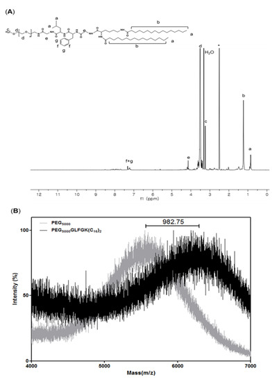 PEG-GLFG lipid was synthesized using Fmoc chemistry as the synthesis procedure shown in Figure 2 [16]. PEG-GLFG was analyzed using 1H-NMR spectroscopy in a DMSO-d6 solvent. As shown in Figure 3A, PEG is at δ (in ppm) 3.25 [CH3OCH2–], 3.51 [–OCH2CH2–], glycine is at δ 4.14 [–COCH2NH–], leucine is at δ 0.86 [–CHCH2CH(CH3)2)], phenylalanine is at δ 7.23, 7.32 [–(C6H5)NH–], and palmitic acid signal is at δ 1.24 [–CH2CH2CH2–]. 13C-NMR of PEG-GLFG is provided in supporting information (Supplementary Materials Figure S1). The molecular weight (Mw) of native PEG and PEG-GLFG were measured by MALDI-TOF MS (Figure 3B). The Mw of native PEG was measured around 5549.1 m/z, and PEG-GLFG was about 6531.8 m/z. These result shows that the increase in Mw of 982.7 m/z is almost similar to the calculated value of GLFGK(C16)2 (979.5 m/z). Synthesis yield of PEG-GLFG lipids was 66.3%.