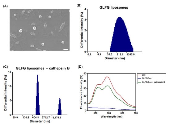 Characterization of GLFG liposomes and GLFG/Dox. (A) Morphology of GLFG liposomes by FE-SEM (scale bar = 200 nm), DLS of native GLFG liposomes (B), and GLFG liposomes treated with cathepsin B (C). (D) fluorescence spectroscopy of free Dox, GLFG/Dox, and GLFG/Dox treated with cathepsin B.