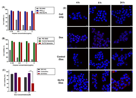 Cathepsin B is overexpressed in some of cancer cells. Several studies have reported that in infiltrative cancer, the cells secrete proteases, including cathepsin B, at high levels. Hep G2 cells exhibit high levels of cathepsin B activity [21]. The effects of PEG-GLFG and GLFG liposomes were studied in Hep G2 cells. To evaluate the cytotoxicity of the polymer, PEG-GLFG, the MTT assay was conducted. As shown in Figure 5A, PEI 25kD-treated cells showed 30% viability at treatment concentrations below 1.0 µg/µL, and PEI 25kD exhibited high cytotoxicity compared with PEG. Cells treated with PEG-GLFG exhibited over 80% viability at all concentrations, which could explain the negligible cytotoxicity. GLFG liposomes also exhibited over 80% viability on the cells (Figure 5B). These results indicate that PEG-GLFG and liposomes exhibited high biocompatibility in vitro with potential for use as drug carriers.