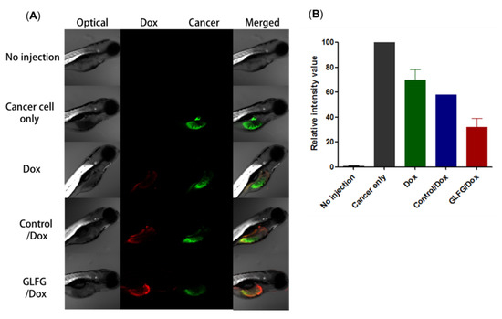 A zebrafish cancer injection model was used to confirm the anticancer activity of GLFG/Dox (Figure 6). Hep G2 cells were dyed with a cell tracker (green) and injected into zebrafish yolk using a micro-injection system in vivo [28]. Free Dox, control/Dox, and GLFG/Dox were added to the larvae water at a concentration of 5 µM, and the larvae were incubated for 48 h. After incubation, the larvae were observed under a confocal microscope. The larvae treated with free Dox and control/Dox showed marginally lower cancer cell-associated fluorescence intensity than cancer cell-injected larvae. The larvae treated with GLFG/Dox exhibited low levels of cancer cell intensity, which indicates that GLFG/Dox caused significant inhibition effects on the transplanted cancer cells. These results demonstrated that cancer cell growth was inhibited to a higher degree in larvae treated with GLFG/Dox than that in the control group larvae [28]. This confirms that PEG-GLFG facilitated the circulation of GLFG/Dox in the bloodstream of zebrafish, and subsequently, increased the retention time of drugs and cancer-specific drug release, and thereby effectively exerted an anticancer effect. Therefore, GLFG/Dox represents a promising drug delivery system for use in cancer therapy.