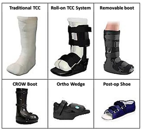 - Applewhite, A.J. Following the Evidence for Total Contact Casting as First-Line Treatment of DFUs in the Wound Clinic. Today’s Wound Clin. 2016. Available online: https://www.todayswoundclinic.com/articles/following-evidence-total-contact-casting-first-line-treatment-dfus-wound-clinic (accessed on 16 June 2020).