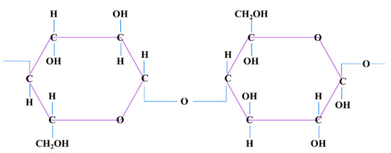Generally, cellulose is well known for its abundance of availability from plant sources. Cellulose is known to poses a strong intermolecular bond, which makes it impossible to dissolve in most of the solvents. Meanwhile, in a liquid state, cellulose exhibits great stability, optical, and mechanical characteristics [32,33], and, due to its ability to retain moisture, it can expedite the wound healing mechanism [34]. Generally, cellulose can be classified into natural and synthetic. Natural cellulose is derived from vascular plants, animals, or minerals. Synthetic cellulose is man-made modified cellulose from natural cellulose source [57,58]. Natural and synthetic cellulose are both bound together by intra- and inter-hydrogen bonds. Plant cellulose usually contains impurities such as lignin and hemicellulose whereas bacterial cellulose appears pure by nature. This makes the plant cellulose possess less crystalline property when compared to the bacterial cellulose [59]. Figure 4 shows the structure of cellulose.