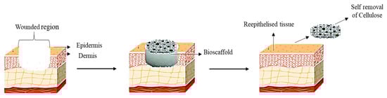 Cellulose can provide front-line protection against foreign material, including all types of cellulose derivatives. The bacterial cellulose (BC) is originated from a membrane of biosynthetic microfibrillar cellulose formed by Acetobacter Xylinum or other types of selected bacteria [60]. The bacteria are a non-harmful pathogen that possess the ability to provide a moisture surface to improve the debridement process and to expedite the re-epithelisation in chronic ulcers. In a wet state, the membrane of the cellulose has 84–89% crystallinity property, mechanical strength, and the capability to absorb water [61,62], which gives the capacity to shorten the duration of healing phases [61]. Besides that, BC has been scientifically proven to be biocompatible, biodegradable, non-toxic, and exceptionally pure that chemically resemble cellulose-derived from plants. Thus, BC has shown the intrinsic features that are suitable for a bio-scaffold as a protective barrier for skin injury in various form such as wound dressing [37].